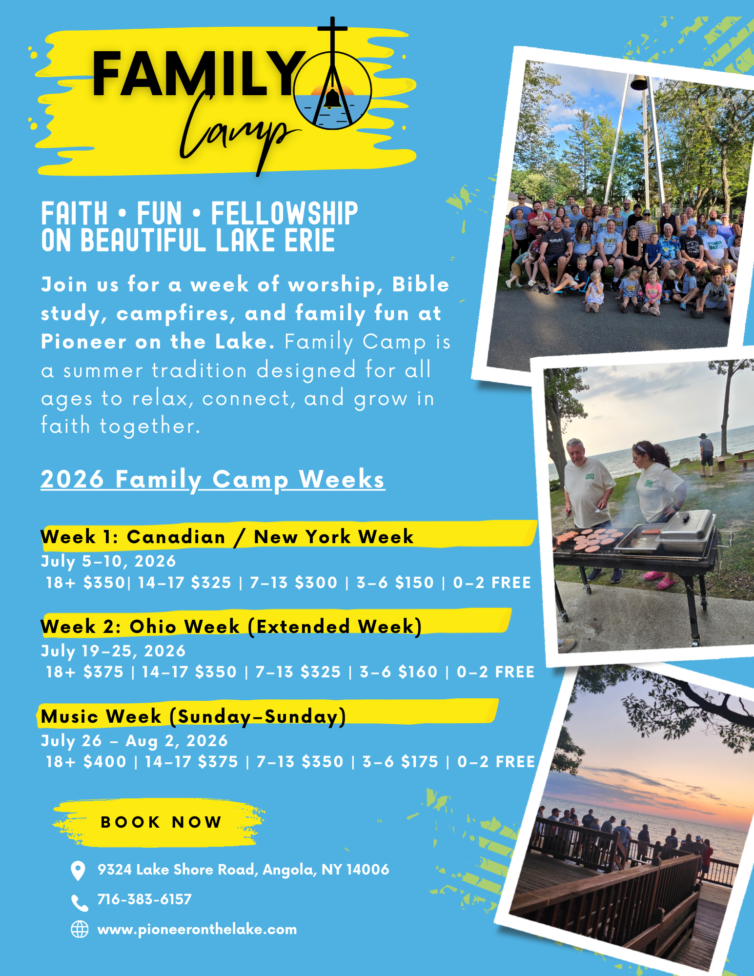 Come join us for one of our Family Camp weeks filled with fun and fellowship for the whole family! Family Camps run Sunday through Friday select weeks throughout the summer. Relax and refresh on the beautiful shores of Lake Erie. Enjoy daily worship, Bible study, campfire devotions, and plenty of activities to keep the whole family, young and old, engaged!