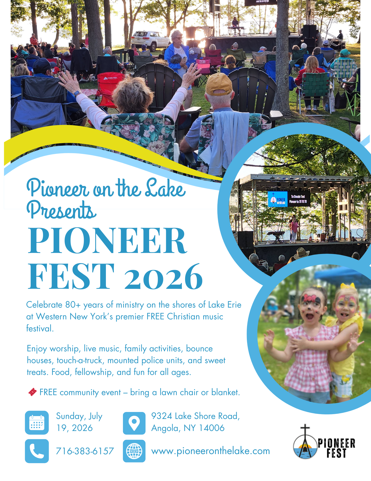 We are thrilled to invite you to an amazing day at Pioneer on the Lake as we celebrate 80 years of Christian ministry! Enjoy lake breezes, sunshine, hot dogs/hamburgers, ice cream, bounce houses, face painting, tractor train rides, worship music, and so much more.